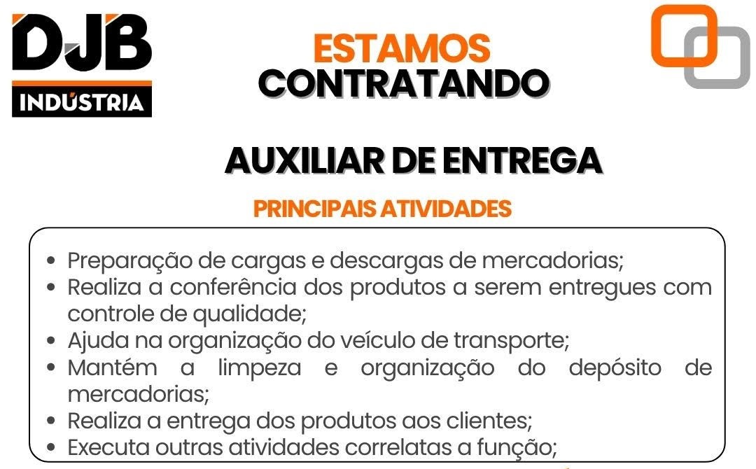 A DJB Indústria, empresa conhecida pela qualidade e compromisso com seus colaboradores, está com vaga aberta para Auxiliar de Entrega. A oportunidade é ideal para quem busca uma colocação estável, com bons benefícios e chances de crescimento dentro da empresa.