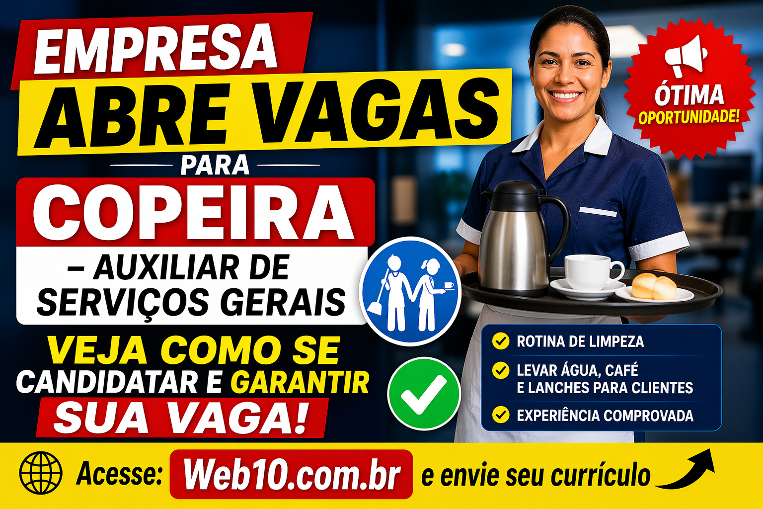 Uma empresa abre vagas para copeira – auxiliar de serviços gerais, trazendo uma ótima chance para quem busca entrar ou voltar ao mercado de trabalho. Além disso, essa oportunidade é ideal para pessoas que já têm experiência com limpeza e atendimento simples ao público.