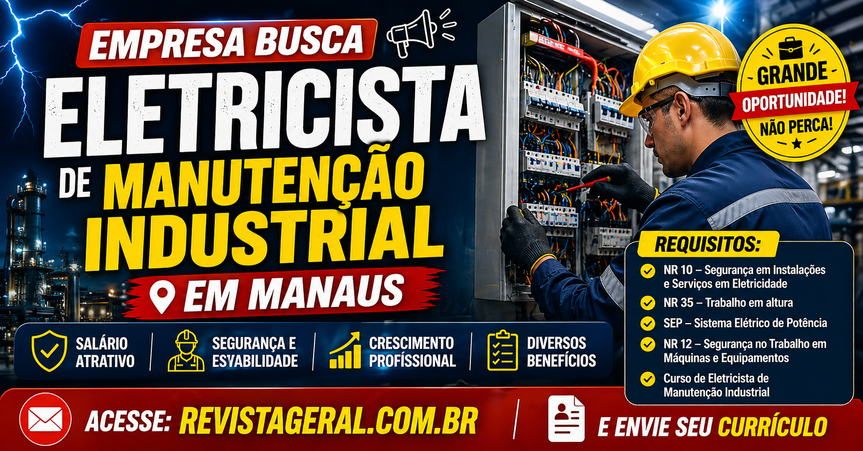 Para disputar essa vaga de Eletricista em Manaus, a empresa informou alguns cursos e qualificações obrigatórias. Por isso, é importante verificar se toda documentação está em dia.