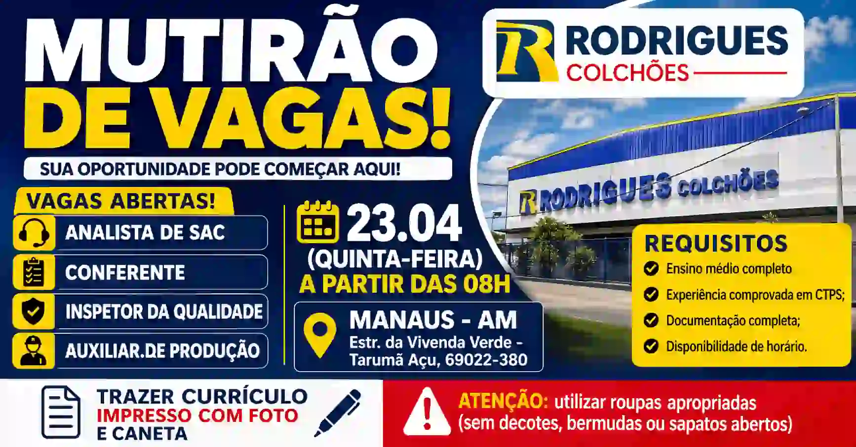 O mutirão de vagas da Rodrigues Colchões em Manaus representa uma excelente oportunidade para quem deseja ingressar ou se reposicionar no mercado de trabalho. Com vagas em diferentes áreas e processo seletivo presencial, essa pode ser a chance que você estava esperando.
