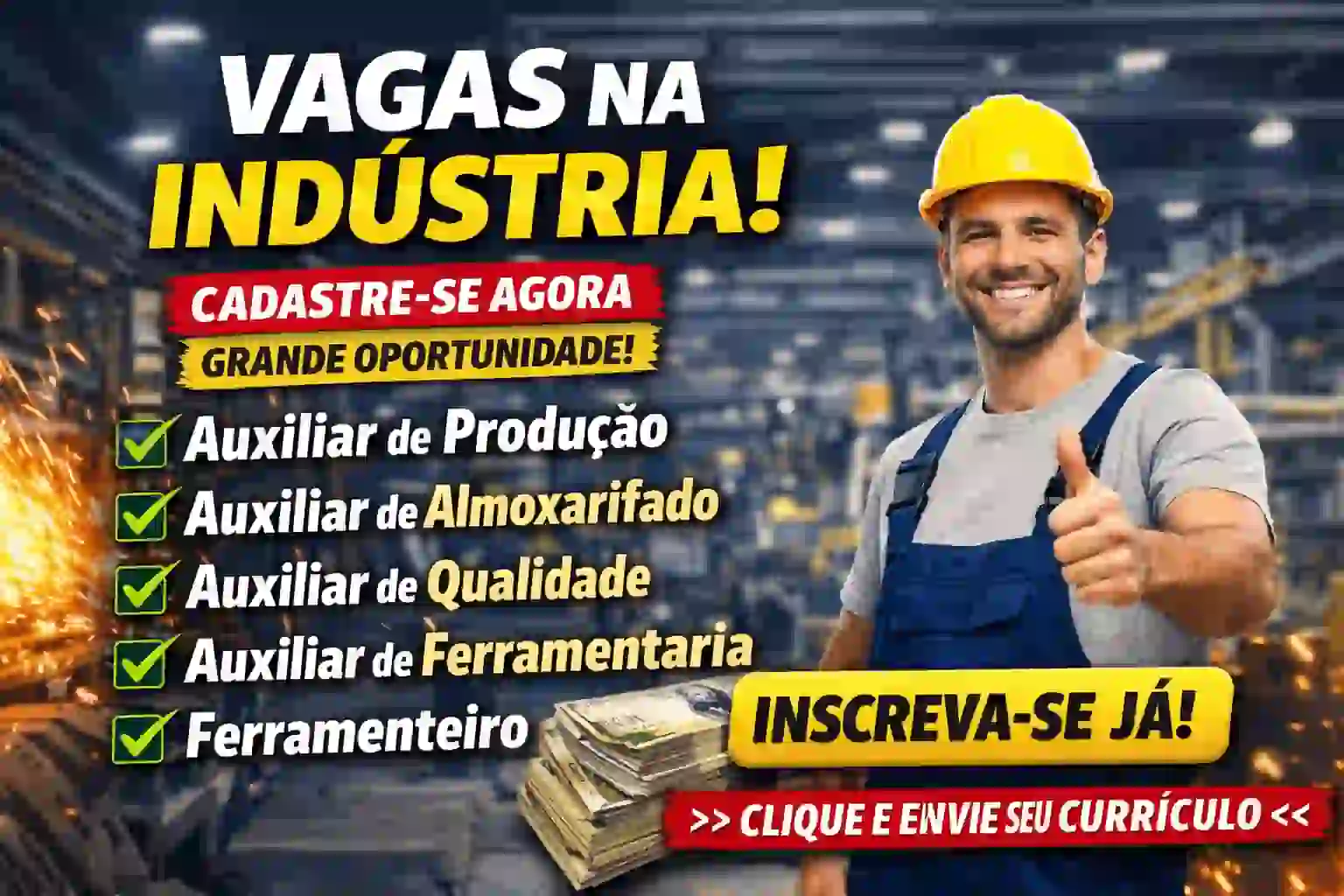 Cadastre seu currículo para vagas na indústria: auxiliar de produção, almoxarifado, qualidade e ferramentaria. Entre no banco de talentos e aumente suas chances de contratação.